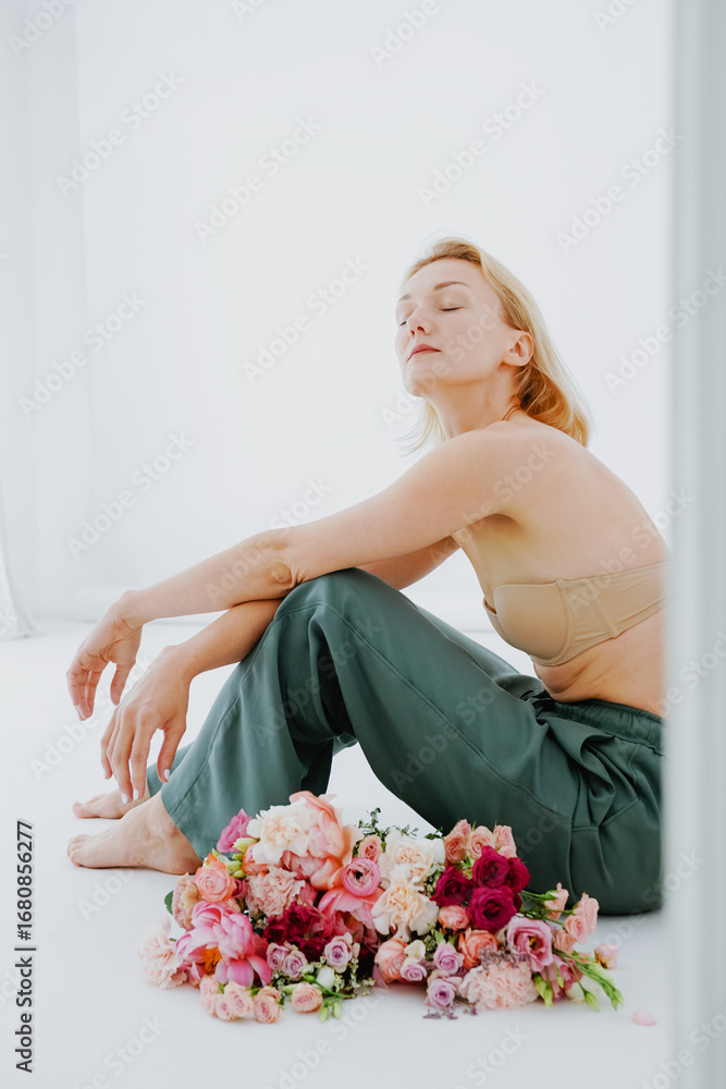 Young beautiful girl and flowers in studio. Confident woman with flowers. Female with peonies.