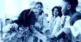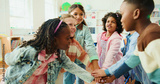 Education, huddle and motivation with children in class of elementary school for success or support. Hand stack, learning and study with group of kids in classroom for achievement as friends