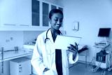 Smiling doctor woman in coat using tablet in examination room