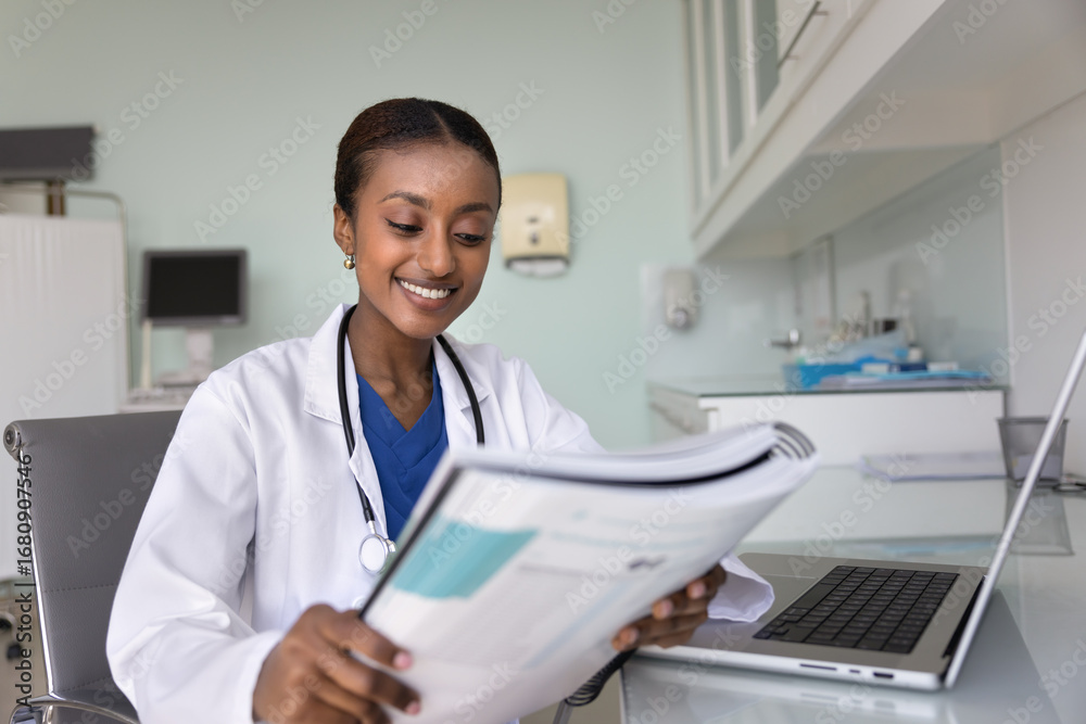 Woman doctor working seated at desk in modern examination room