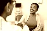 African female clinic patient shaking hands with therapist or cardiologist