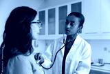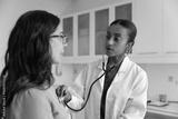 Doctor using stethoscope to listen heartbeat of elderly woman patient
