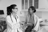 Mature 60s female doctor shaking hands with young woman patient