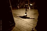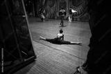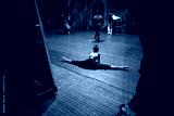 ballet, theater, background. on backstage of theater dancers are rehearsing, ballerina dressed in gorgeous costume in purple shades and with red hair doing the splits nearby decoration