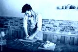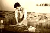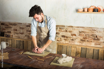potter, workshop, ceramics art concept - smiling young brunette man dressed in an apron, male hands kneading the fireclay, a ceramist with raw material on wooden table with sculpting tool set, jugs
