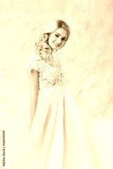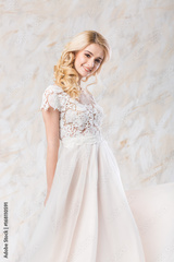 fashionable wedding dress, beautiful blonde model, bride hairstyle and makeup concept - stunning young woman in luxury white gown indoors on light background, pretty female posing with a smile