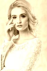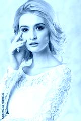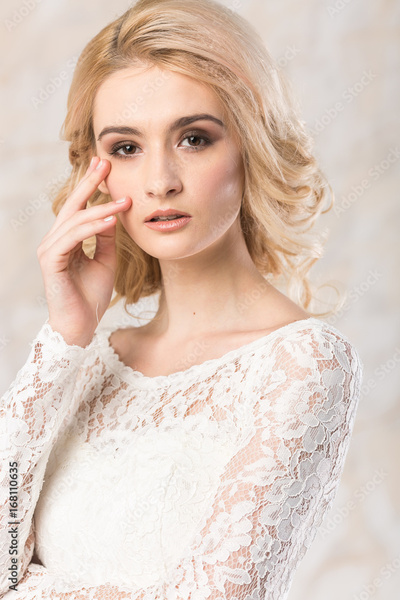 fashionable white gown, beautiful blonde model, bride hairstyle and makeup concept - young romantic lady in wedding festive dress standing indoors on light background, pretty woman posing