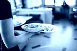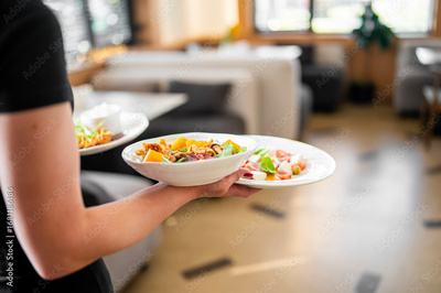 Waiter in black uniform holding three plates with fresh salads in a bright modern restaurant. Healthy food service concept in hospitality setting