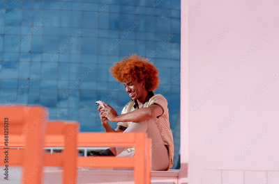 Smiling young African American man with curly ginger hair sitting outdoors, holding smartphone in both hands, enjoying connection, instant messaging, and positive digital interaction.