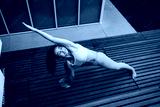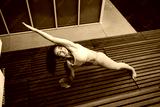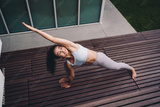 Smiling woman performing extended side angle yoga pose on wooden deck. Conceptual fitness stock photo symbolizing resilience, positivity, mindfulness, and connected wellness.