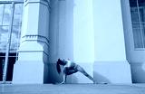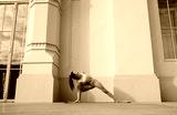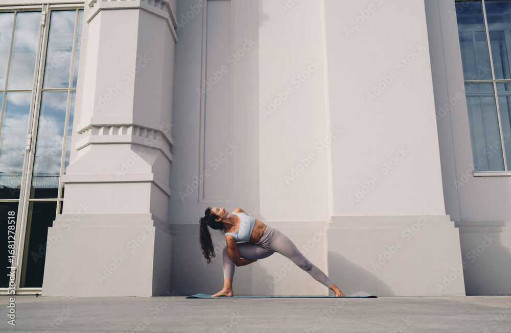 Young woman in yoga twist pose, hand grounded, body leaning, gaze upwards. Conceptual fitness photo symbolizing resilience, empowerment, mindfulness, alignment, and digital wellness practice.