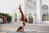 Female athlete holding forearm stand with extended legs in outdoor practice. Conceptual yoga stock photo expressing empowerment, mindfulness, resilience, balance, and digital health.
