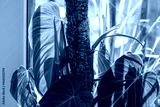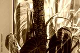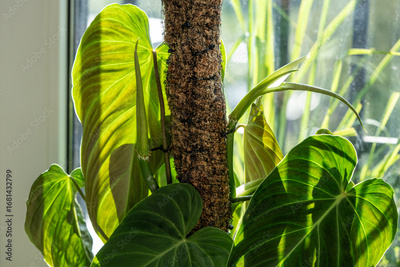 Closeup of Philodendron Splendid plant support homemade sphagnum moss pole and plastic fine-mesh garden netting. Climbing houseplant growth aid with plastic ties. Turdy support for upward plant growth