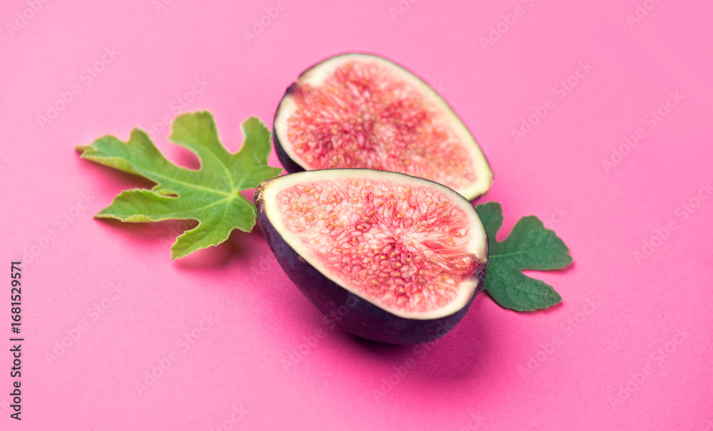 Fig fruits. Ripe sweet fresh figs fruit with leaf close up, on pink background, half of bio ripe Mediterranean fig, sliced.