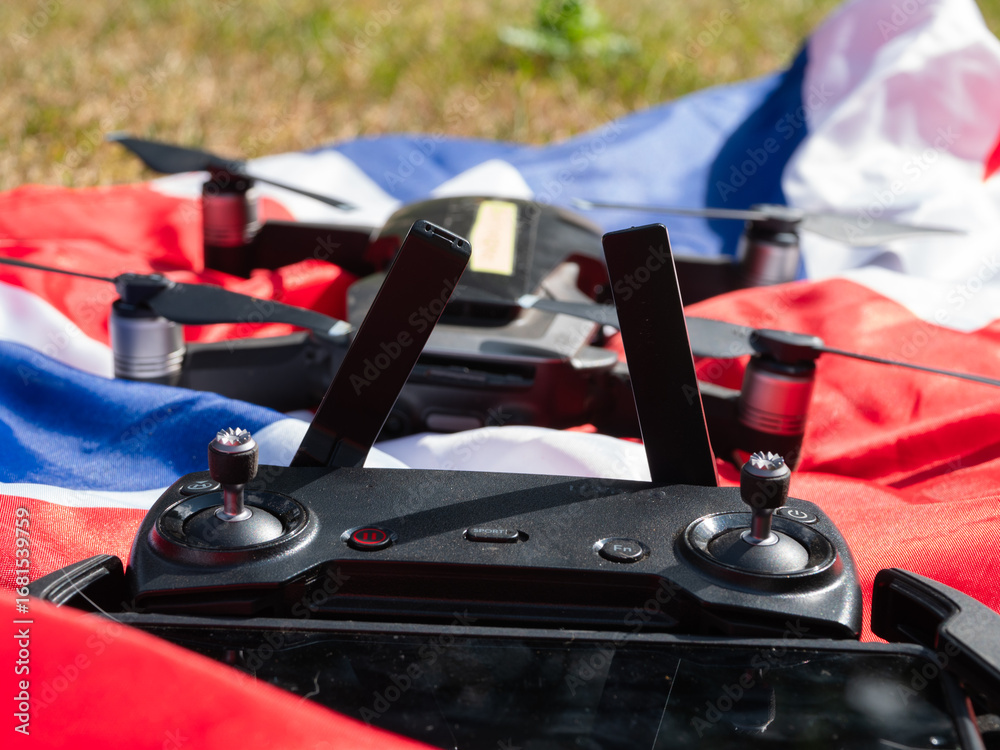 British Flag and hands with drone and remote controller in background