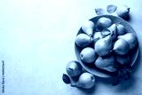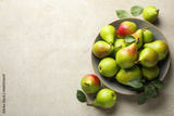 Fresh ripe pears and green leaves on light grey table, flat lay. Space for text