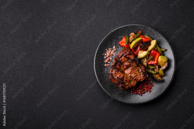 Pork breast steak, grilled fillet, healthy food, lunch. Pork steak as food background