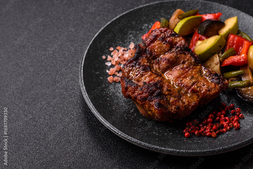 Pork breast steak, grilled fillet, healthy food, lunch. Pork steak as food background