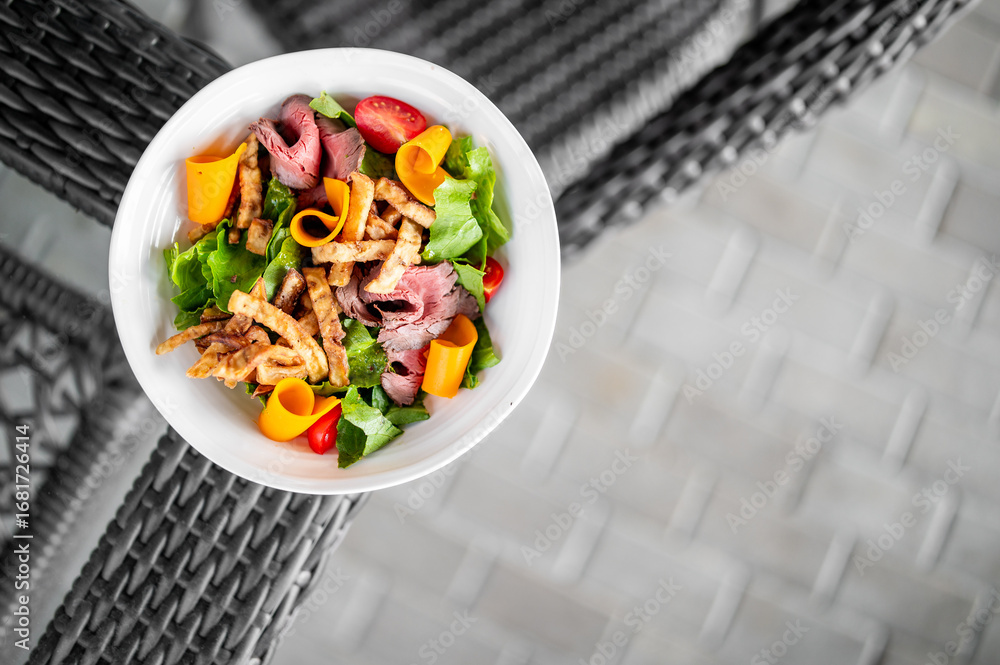 Fresh salad with roast beef, cherry tomatoes, cheese curls, and tortilla strips in a white bowl on a woven chair, outdoor dining setting, top view