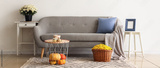 Beautiful chrysanthemums, table and sofa in interior of living room near white wall