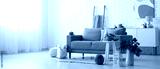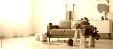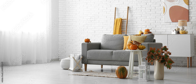 Interior of light living room with autumn decor, sofa and table