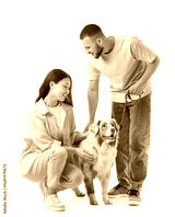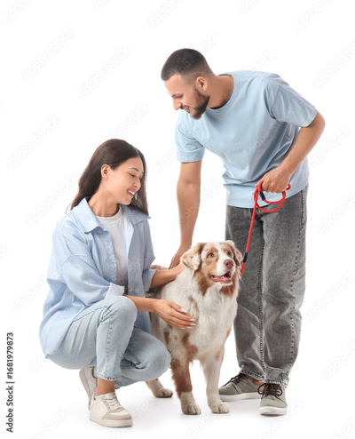 Young couple with Australian Shepherd dog on white background