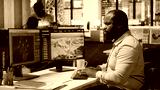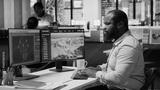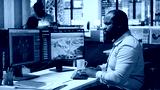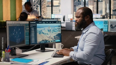 Worker enters office, uses electric grid and wind farm layout optimization tools to enhance clean energy systems. Technician starts work on power lines and futuristic wind turbine simulation, camera B