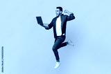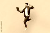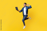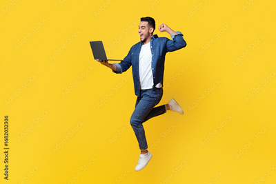 Emotional arab young man jumping up, using new modern laptop, raising fist up and smiling over yellow studio background, trading online, copy space for text or advertisement, panorama