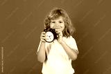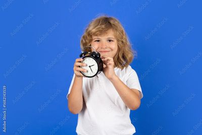Funny child holding alarm clock with funny face. Morning school time concept with surprised kid. Portrait of kid with big clock and shocked expression. Alarm ringing while kid looks confused.