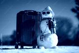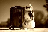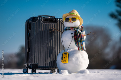 Winter gift from Snowman. Winter gifts sale concept. Snowman in hat and camera holding suitcase, luggage with gift. Winter gift delivery service. Snowman is Santa helper for delivery gift.