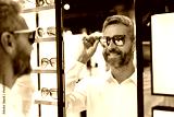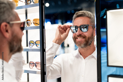 Man in sunglasses indoors portrait. Mature guy choosing eyeglasses. Fashion man in trendy eyewear. 40s man buying sunglasses. Customer trying glasses. Man in sunglasses boutique.