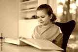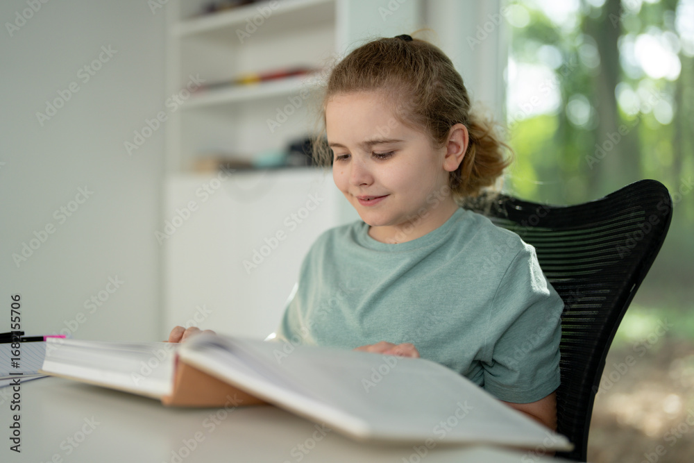 Child enjoying book in cozy room. Kid reading big book with smile. Clever student holding open book. Cute child studying book at home. Boy learning knowledge from books.