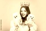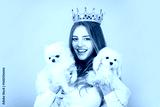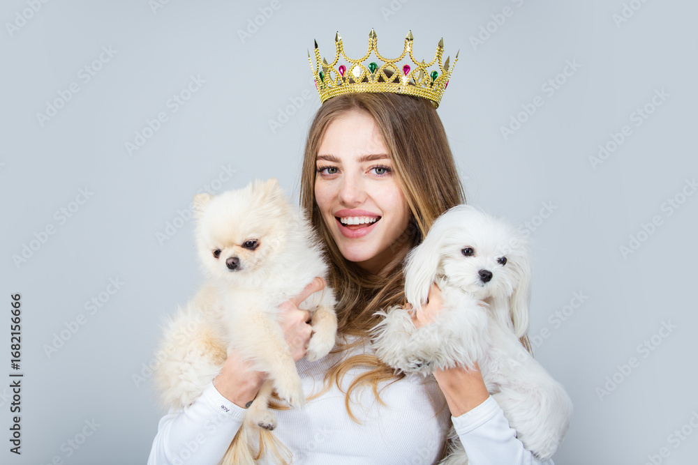 Beautiful girl dressed as a princess hold puppy. Romantic portrait with dog and queen. Lovely girl in crown. Fairy-tale model with dogs. Elegant woman with small dog. Cute doggy in princess hand.