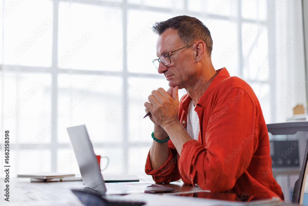 Busy business man manager working on laptop in office writing notes. Professional businessman analyst using computer checking corporate data, watching online webinar, elearning concept.