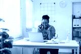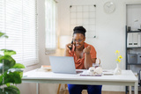 Happy positive woman entrepreneur sitting in home office, working on laptop computer, talking on cell phone.