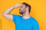 Man suffering from headache desperate, stressed because headache pain and migraine. Man touching her temples feeling stress. Guy suffering from headache. Cold symptoms. Headache concept.