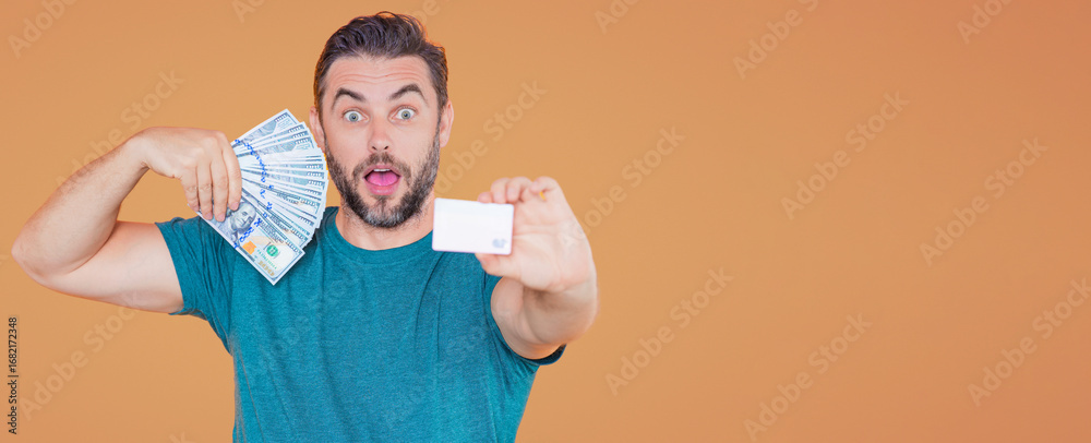 Man hold money on beige studio isolated banner background. Rich man in suit with money dollar bills. Successful businessman with dollar banknotes.