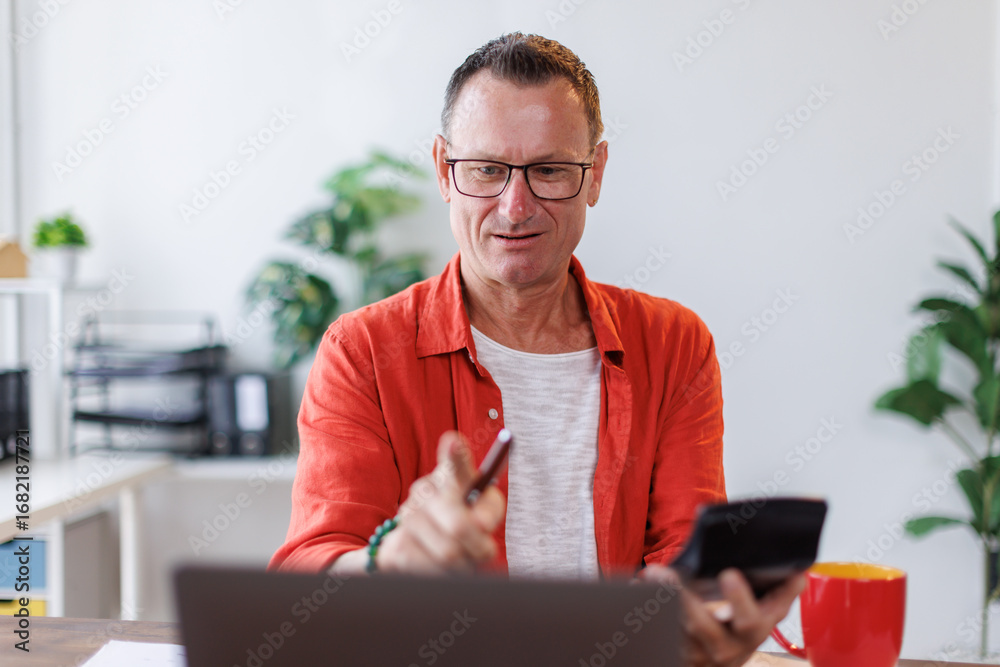 Serious and focused financial accounting on paper work at office, mature man using calculator and laptop for calculating reports and summarizing accounts, businessman at work in casual clothes.