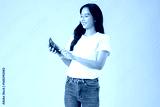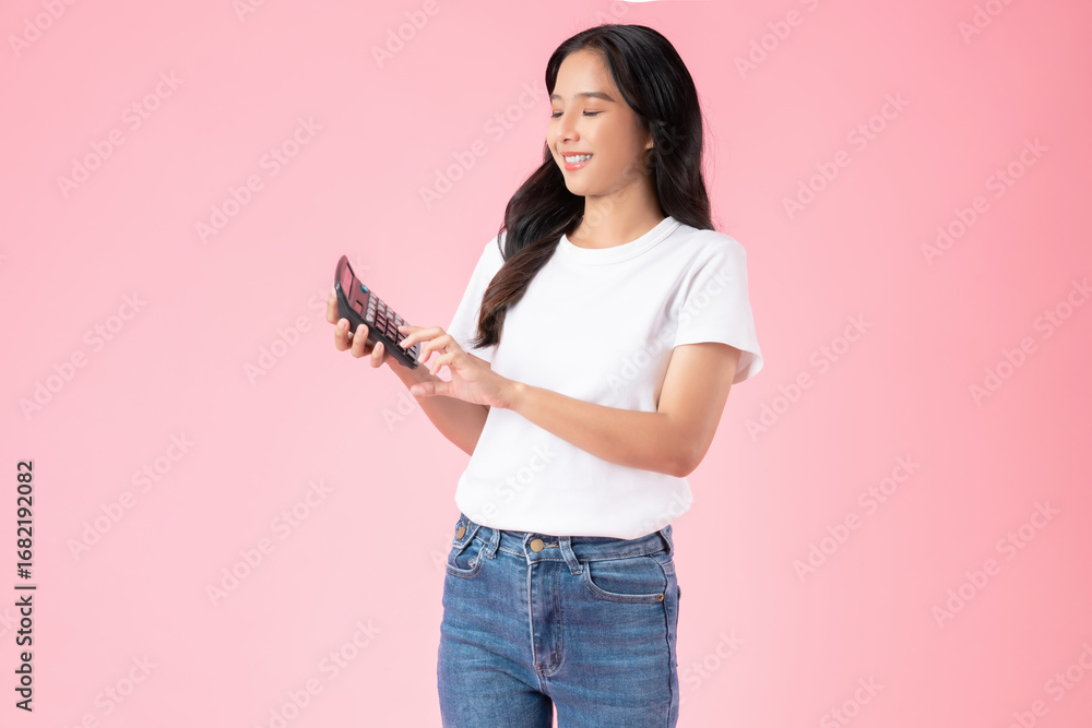 Cheerful beautiful Asian woman stand with hand holding calculator on pink background.