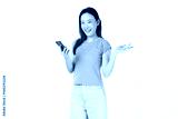 Beautiful Asian woman holding smartphone and smiling on white background.