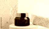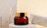 Cosmetic bottles on a stone podium, Blank label package for mock up on a beige background. The concept of natural beauty products.