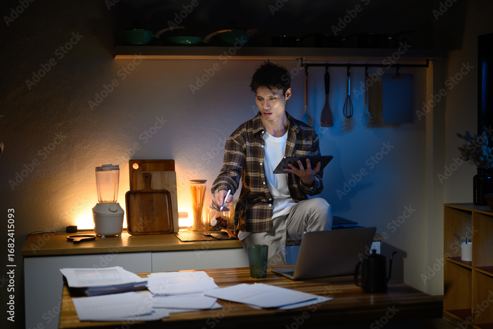 Young man working late at home, sitting on kitchen counter with digital tablet in hand