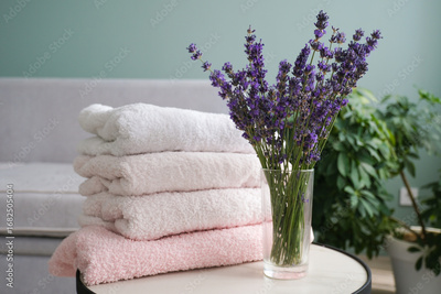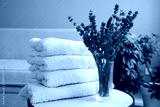 A stack of towels and lavender. The concept of protecting clothes from moths
