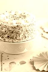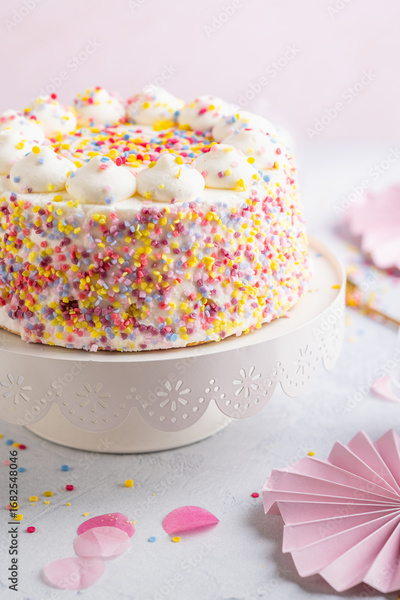 Confetti birthday cake, cream cake with sweet colorful sprinkles