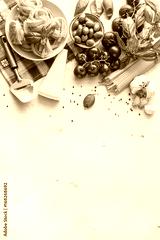 Italian food cuisine and ingredients on white concrete table. Spaghetti Tagliatelle olives olive oil tomatoes parmesan cheese garlic pepper and basil leaves and checkered tablecloth.