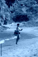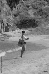 A buetiful female in her early 40's in swimsuit on the beach by the sea with headphones, phone and a bag