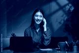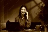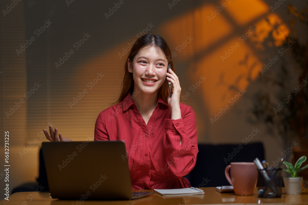 Asian freelance woman working on laptop computer and talking on mobile phone at her home workspace at night
