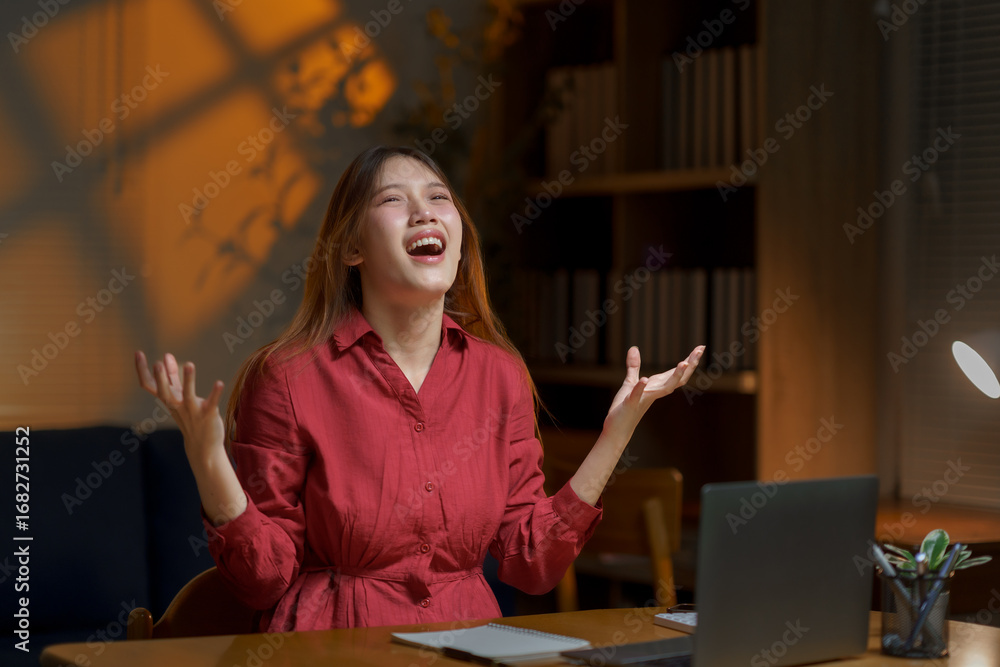 Asian businesswoman raising arms and screaming of joy after closing important deal working late at night in office