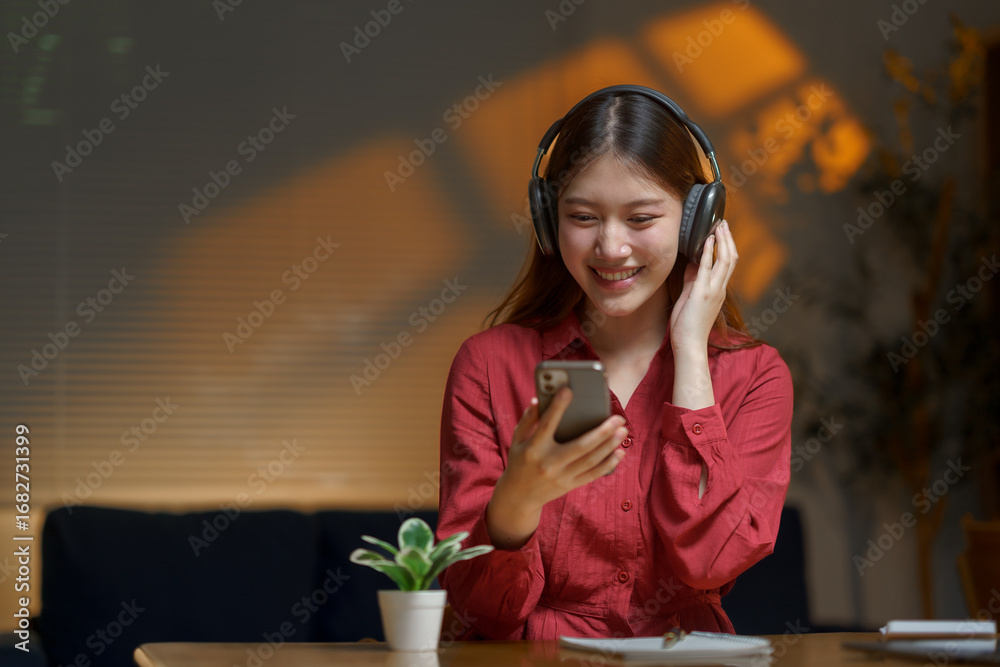 Asian freelancer enjoying music on her smartphone while working comfortably from home during a cozy night, smiling and relaxed