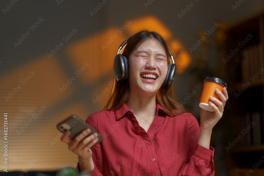 Happy asian woman listening to music with headphones, holding smartphone and coffee, laughing with closed eyes at home